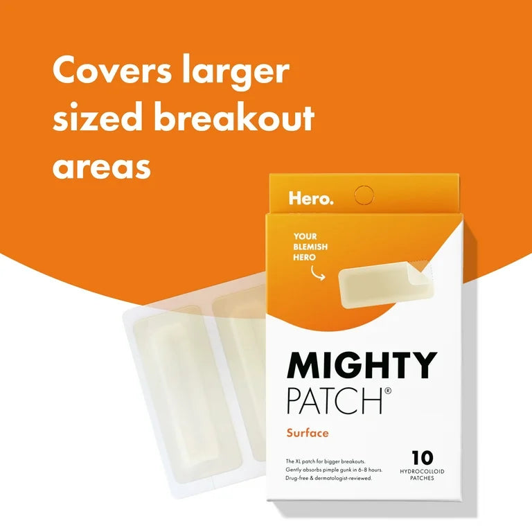 Mighty Patch Surface is the only XL hydrocolloid acne patch that covers bigger breakout areas to take down large pimple clusters in just 6 hours. Each box comes with 10 rectangular hydrocolloid patches on easy-peel perforated sheets.